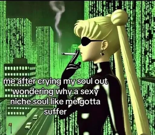 transcription: me after crying my soul out wondering why a sexy niche soul like me gotta suffer