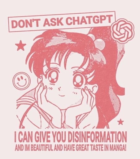 A pink monochrome image with Sailor Jupiter with the caption “Don’t ask ChatGPT, I can give you disinformation and I’m beautiful and have great taste in manga!”