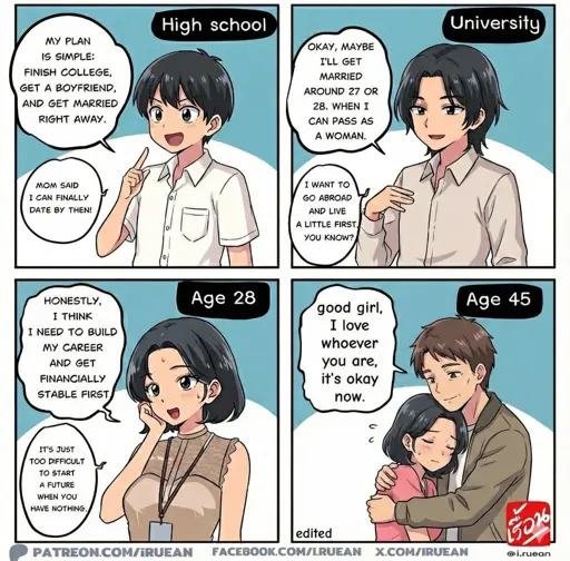 I don’t get the fourth panel. She detransitioned? Or wait, she’s the one being hugged? So she just didn’t age at all? God I wish I could still look 28 at 45