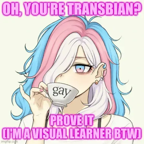[alt text: a woman with long hair dyed in the colours of the transgender flag sips from a teacup with “gay” printed on the side. The top text reads “Oh you’re transbian?” While the bottomt text reads “prove it (I’m a visual learner BTW)”]