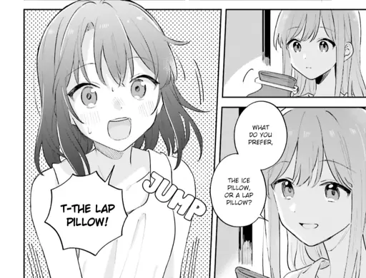 transcription: girl 1: “what do you prefer, the ice pillow or the lap pillow?” girl 2: jumps up “the lap pillow!”